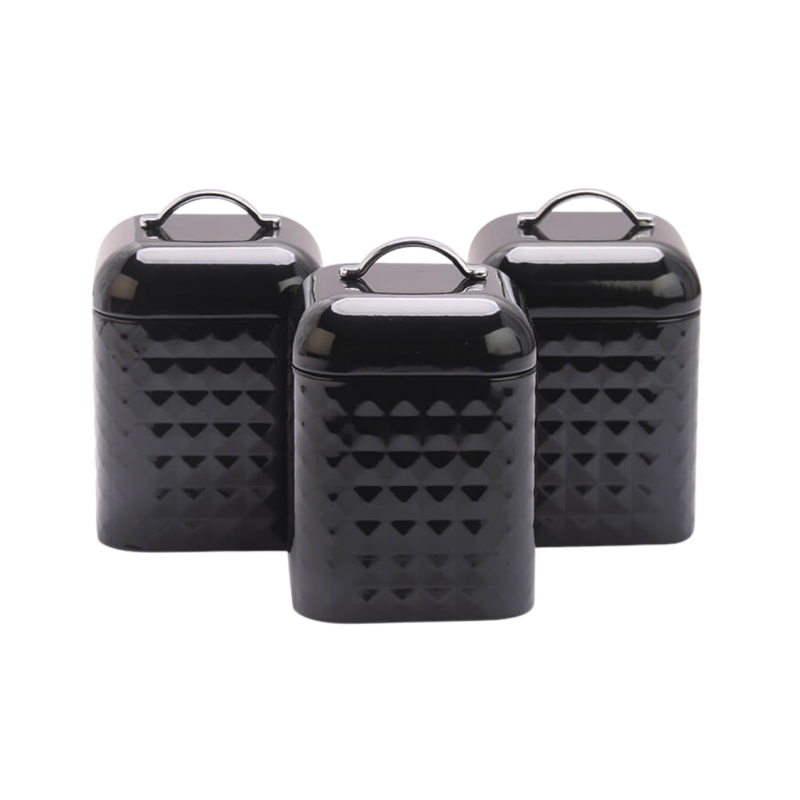 Stilingas ir praktiškas 3 indelių rinkinys, skirtas biriems produktams laikyti. Šie indeliai puikiai tinka kavai, cukrui, arbatai, kruopoms ar kitiems kasdien naudojamiems virtuvės produktams. Elegantiškas juodos spalvos dizainas su subtiliu reljefiniu raštu suteikia modernumo ir tvarkos pojūtį virtuvės interjere.