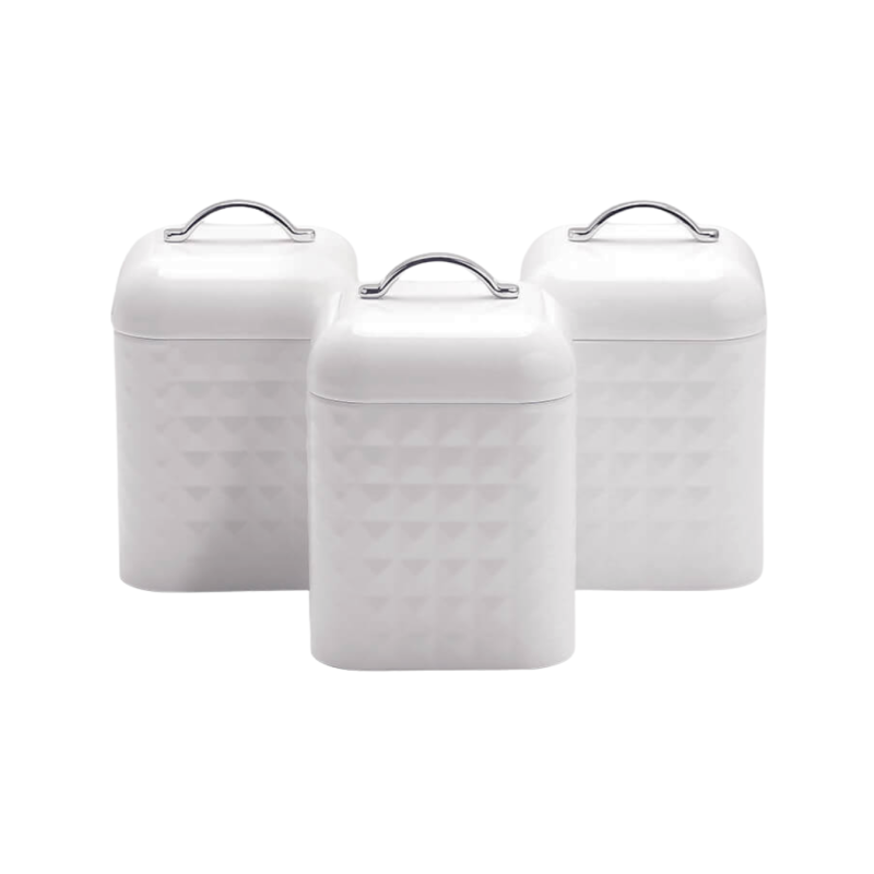 Stilingas ir praktiškas 3 indelių rinkinys, skirtas biriems produktams laikyti. Šie indeliai puikiai tinka kavai, cukrui, arbatai, kruopoms ar kitiems kasdien naudojamiems virtuvės produktams. Elegantiškas baltos spalvos dizainas su subtiliu reljefiniu raštu suteikia modernumo ir tvarkos pojūtį virtuvės interjere.