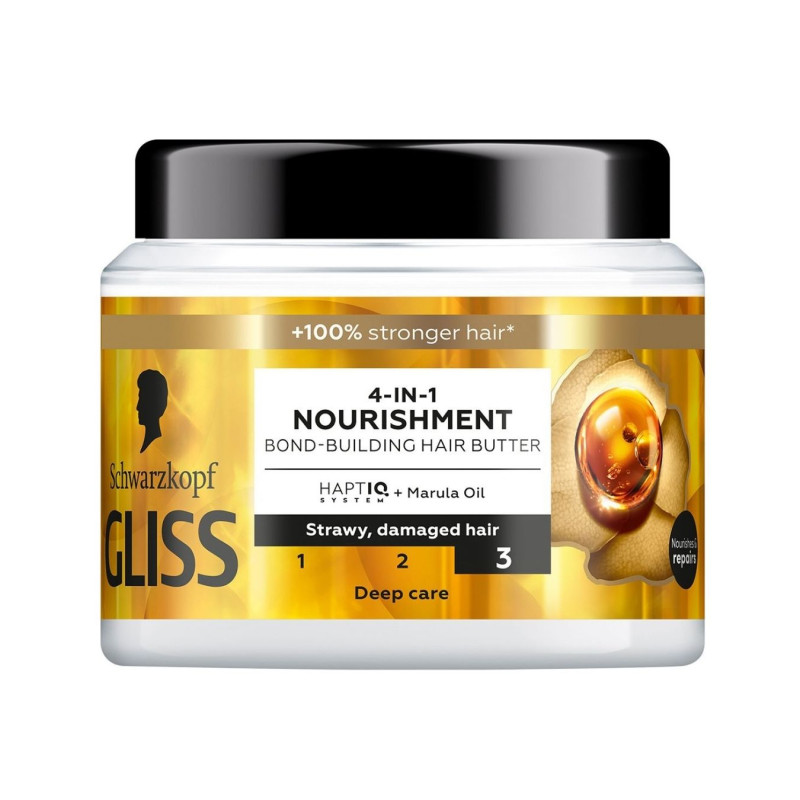 Gliss 4 funkcijų maitinamasis, plaukų saitus atkuriantis sviestas su HAPTIQ sistema ir marulų aliejumi, skirtas ypač sausiems ir pažeistiems plaukams. Intensyviai maitina, stiprina plauko struktūrą ir padeda atkurti vidinius plaukų saitus.