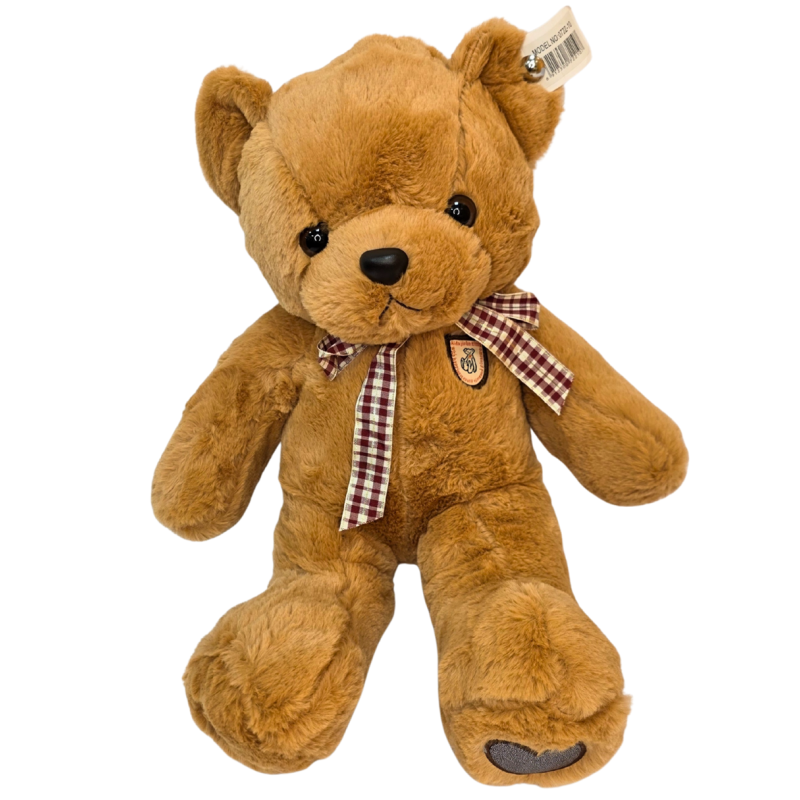 Klasikinis, šiltų spalvų meškutis su stilingu languotu kaspinu – nepamainoma dovana tiek vaikams, tiek suaugusiesiems. Meškutis pasiūtas iš ypatingai švelnaus ir malonaus liesti pliušo, todėl puikiai tinka apkabinti, žaisti ar papuošti kambario interjerą.