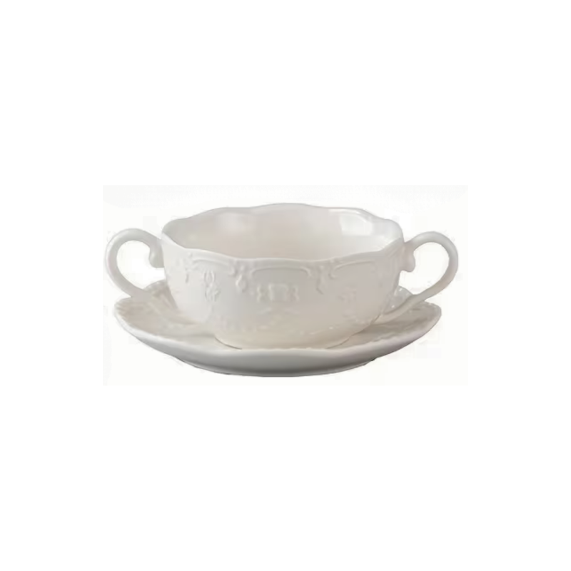 Klasikinis sultinio puodelis su lėkštute, skirtas elegantiškam ir patogiam sultinio, sriubos ar lengvų užkandžių patiekimui. Puodelis turi dvi rankenėles, todėl jį patogu laikyti ir naudoti net su karštu turiniu. Balta spalva ir subtilus dizainas puikiai tinka tiek kasdieniam, tiek šventiniam stalui.