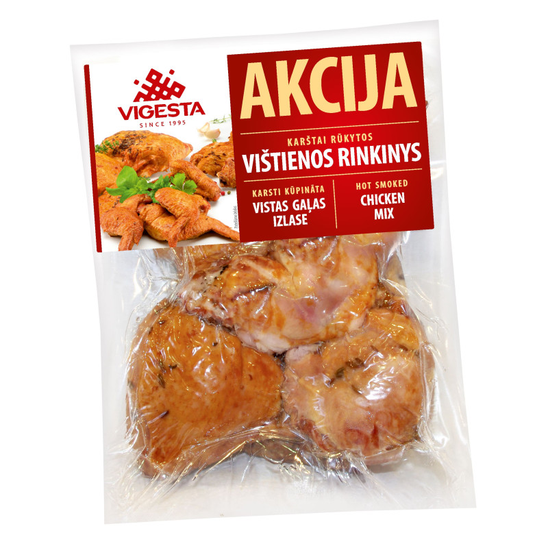 Vištų kilmės šalis ES (ketvirčiai, blauzdelės su sąnariu, šlaunelės, sparneliai), vanduo, druska, stabilizatoriai: modifikuotas krakmolas E1442, E407, E407a, E425, E450, rūgštingumą reguliuojanti medžiaga E451, dekstrozė, antioksidantas E316, mielių ekstraktas, prieskoniai, tirštiklis E415, kvapioji medžiaga, konservantas E250. (Supakuota naudojant apsaugines dujas).