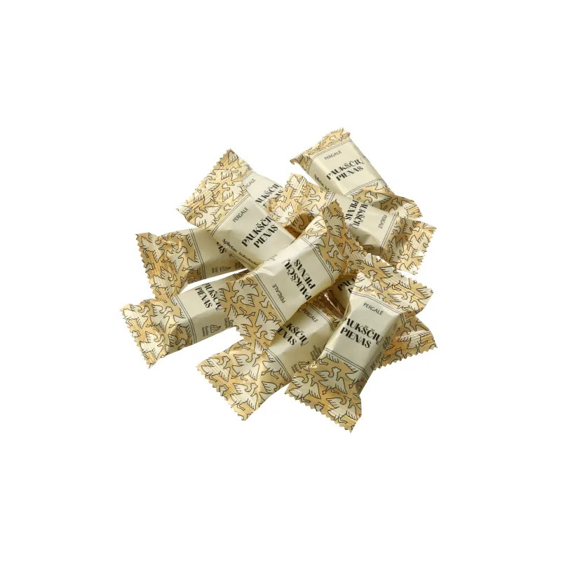 SUDEDAMOSIOS DALYS: saldainiai iš plaktos masės (70%), iš šokoladinio glaisto (30%). Sudėtis: cukraus sirupas (cukrus, vanduo). Šokoladas 30% (cukrus, kakavos masė, augaliniai riebalai (įvairiomis proporcijomis: palmių aliejus, taukmedžio), kakavos SVIESTAS, emulsikliai SOJŲ lecitinas, poliglicerolio poliricinoleatas, kvapioji medžiaga). Sviestas 15%, gliukozės sirupas, saldintas sutirštintas PIENAS, sausas laisvai laikomų vištų KIAUŠINIŲ baltymas 0,7%, stabilizatorius trietilo citratas, tirštiklis agaras, rūgštingumą reguliuojanti medžiaga citrinų rūgštis, konservantas kalio sorbatas, kvapioji medžiaga ir natūralus vanilės skonis (0,002%), invertazės stabilizatorius. Šokolado masė, kakavos produkto sausųjų medžiagų kiekis ne mažesnis kaip 43%. Šokoladinė masė, kurioje yra kakavos SVIESTO ir kitų augalinių riebalų
