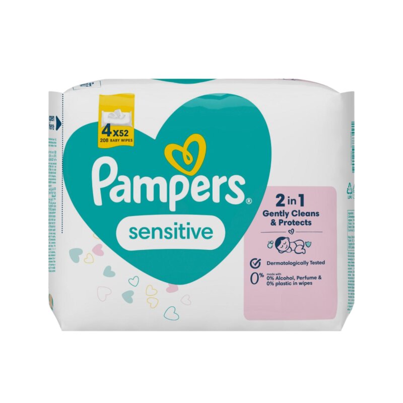 Pampers Sensitive drėgnos servetėlės (208 vnt.) – skirtos ypač jautriai kūdikio odai.