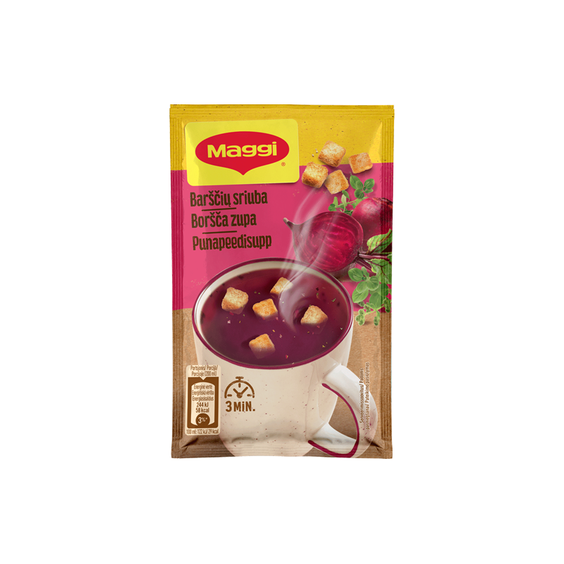 Cukrus, burokėlių sulčių koncentratas 22%, skrebučiai 15,4% (KVIEČIŲ miltai, palmių aliejus, druska, mielės), druska, aromato ir skonio stiprikliai (mononatrio glutamatas, dinatrio 5'ribonukleotidai), kvapiosios medžiagos, rūgštingumą reguliuojanti medžiaga (citrinų rūgštis), saulėgražų aliejus, prieskoniai, žolelės, česnakų koncentratas. Sudėtyje gali būti PIENO, KIAUŠINIŲ, SALIERŲ, GARSTYČIŲ ir SOJŲ.
