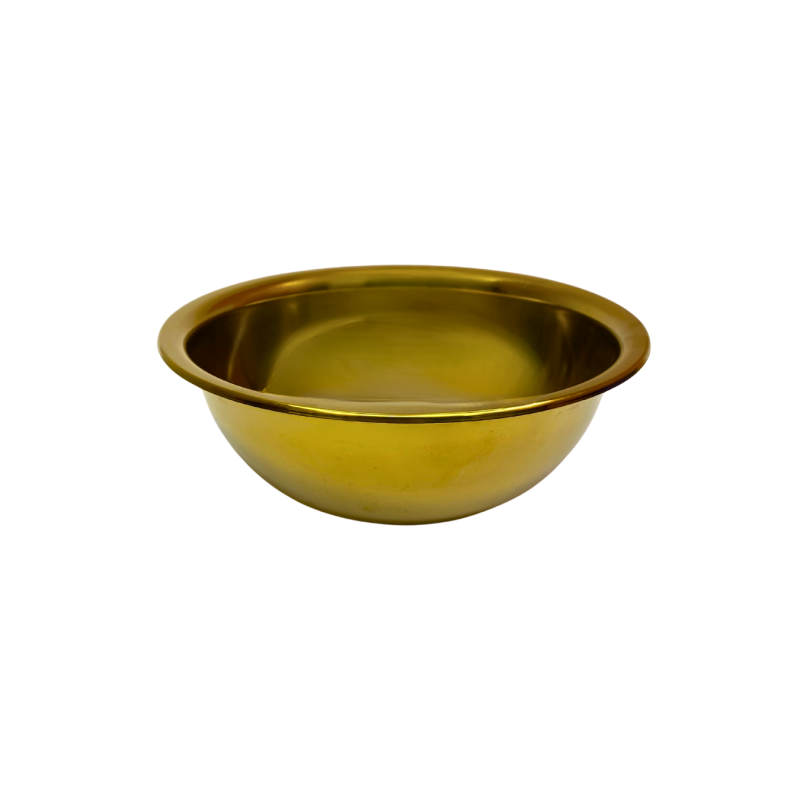 Kompaktiškas ir praktiškas metalinis dubenėlis, skirtas kasdieniam naudojimui virtuvėje. Dėl klasikinės apvalios formos ir elegantiško auksinio atspalvio jis puikiai tinka tiek maisto ruošimui, tiek patiekimui ar serviravimui.