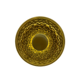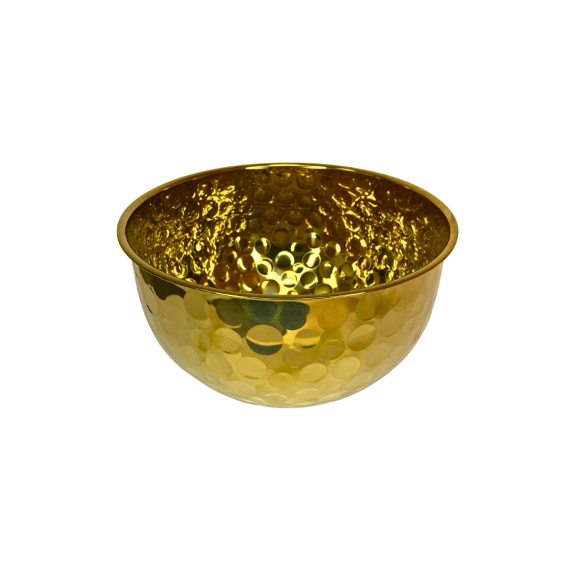 Stilingas ir dekoratyvus metalinis dubuo su išraiškinga, plaktos tekstūros apdaila ir auksinės spalvos paviršiumi. Dubuo ne tik praktiškas, bet ir puikiai tinka kaip interjero akcentas ar stalo puošmena.