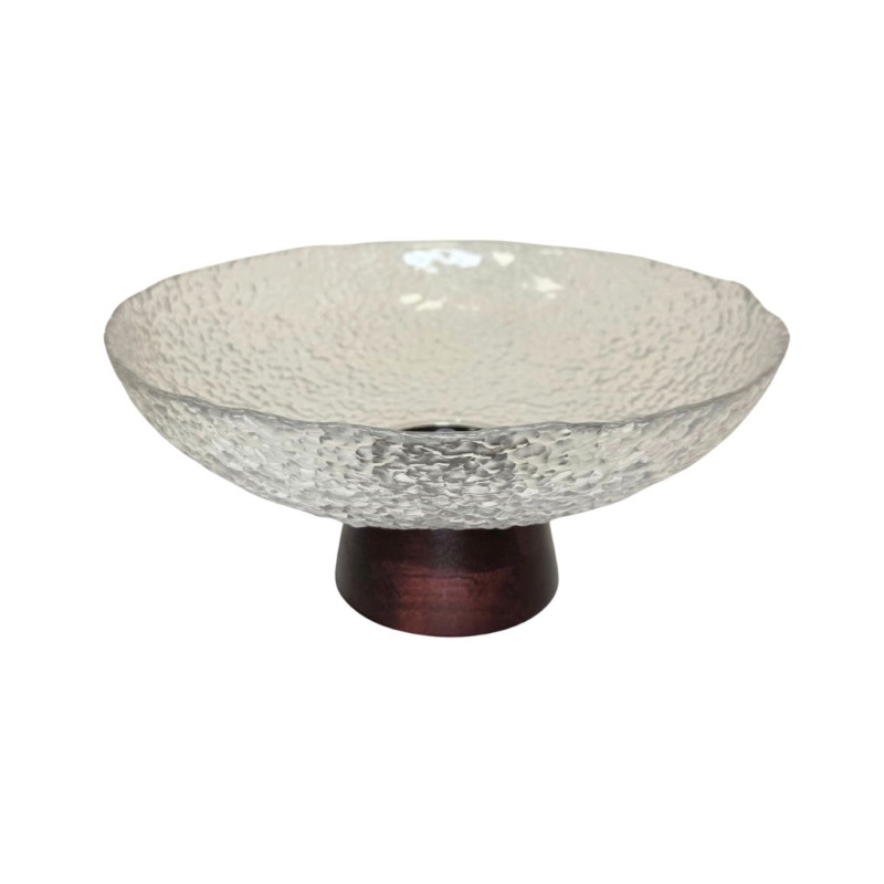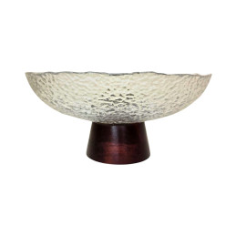 Elegantiškas stiklinis dubuo su dekoratyviniu mediniu pagrindu – stilingas ir praktiškas interjero akcentas. Dubens paviršius dekoruotas subtilia reljefine tekstūra, kuri gražiai atspindi šviesą ir suteikia išskirtinumo. Tamsaus medžio pagrindas suteikia stabilumo bei sukuria modernų kontrastą su skaidriu stiklu.