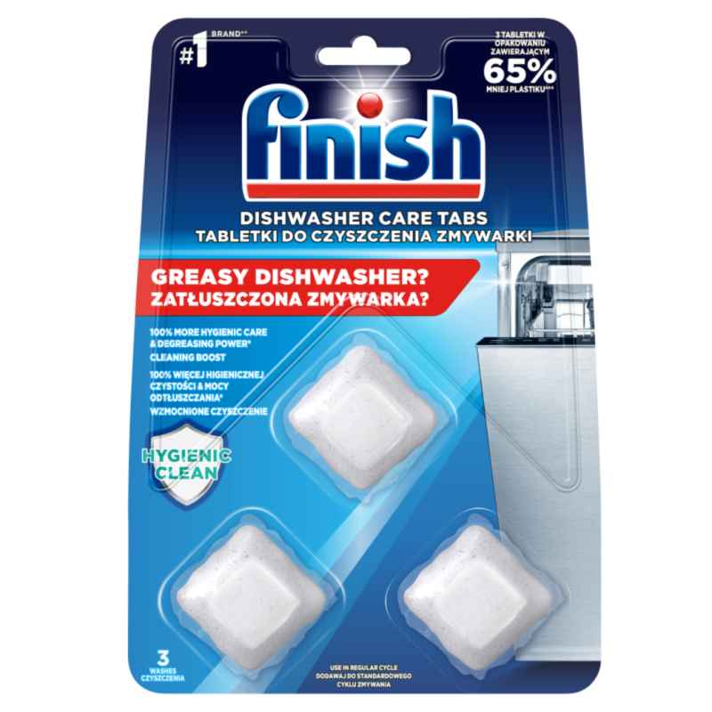 Riebaluota indaplovė? 100 % daugiau higieniškos švaros ir riebalų šalinimo galios. Sustiprintas valymas. Indaplovėje nuolat plaunami nešvarus indai, todėl joje gali kauptis riebalų ir nešvarumų likučiai. Sustiprinto efektyvumo indaplovių valiklio tabletės „Finish Hygienic Clean“ šalina indaplovių riebalus ir nešvarumus bei užtikrina 100 % daugiau higieniškos švaros. Užtenka 3 kartams.