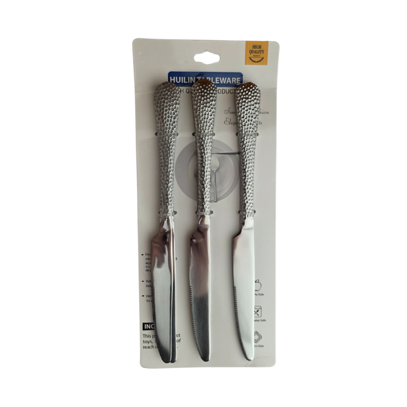 Elegantiški ir tvirti stalo peiliai Huilin Tableware, pagaminti iš aukštos kokybės nerūdijančio plieno. Tekstūruotos rankenos suteikia modernumo ir užtikrina patogų laikymą. Dantyti ašmenys leidžia lengvai ir tiksliai pjaustyti įvairius maisto produktus. Puikus pasirinkimas kasdieniam naudojimui ar šventiniam stalui.