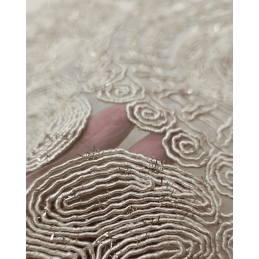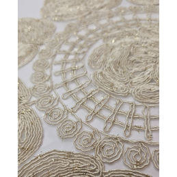 Rankų darbo įspūdį kuriantys nėriniai sujungti į gėlių formos ornamentus, o tarpai tarp jų užpildyti permatomu tinkleliu, kuris suteikia lengvumo ir prabangos pojūtį.