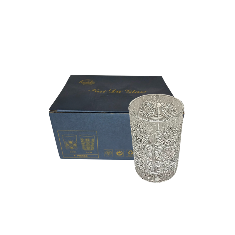 Elegantiškas ir stilingas 6 vnt. stiklinių rinkinys, supakuotas dailioje dėžutėje. Stiklinės pagamintos iš aukštos kokybės stiklo ir dekoruotos graviruotu ornamentu, kuris suteikia rinkiniui prabangos ir išskirtinumo.