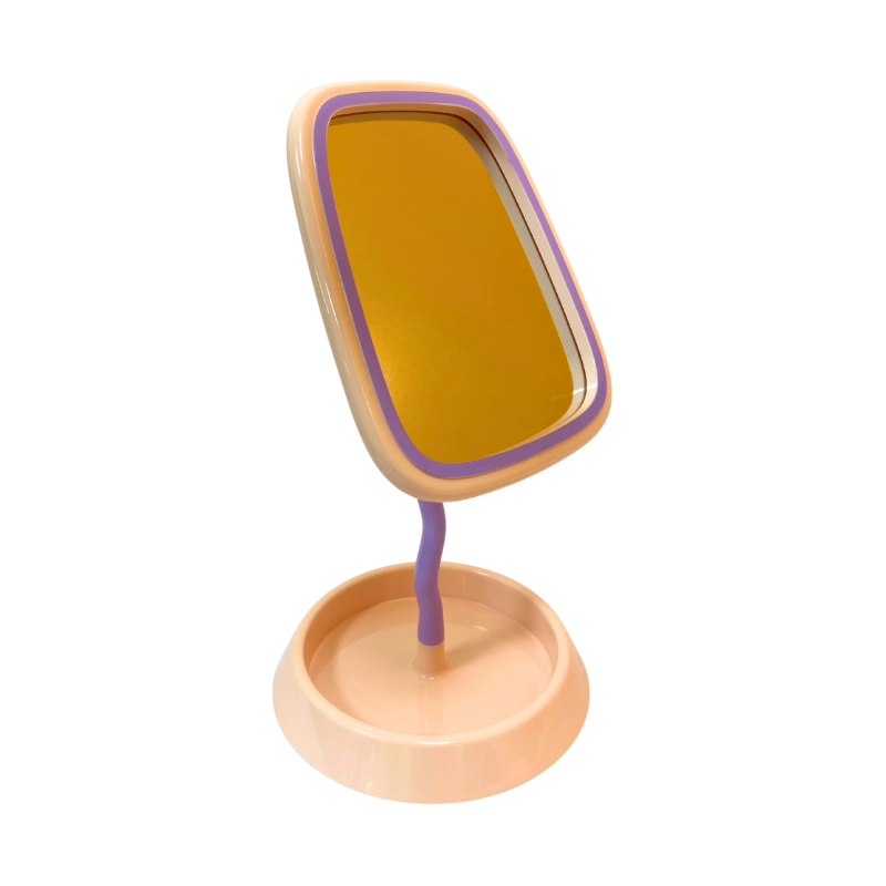 Stilingas ir modernus stalinis veidrodis, puikiai tinkantis makiažui, grožio procedūroms ar kasdieniam naudojimui. Subtilus dizainas su pastelinių spalvų rėmeliu suteikia interjerui žaismingumo ir jaukumo.