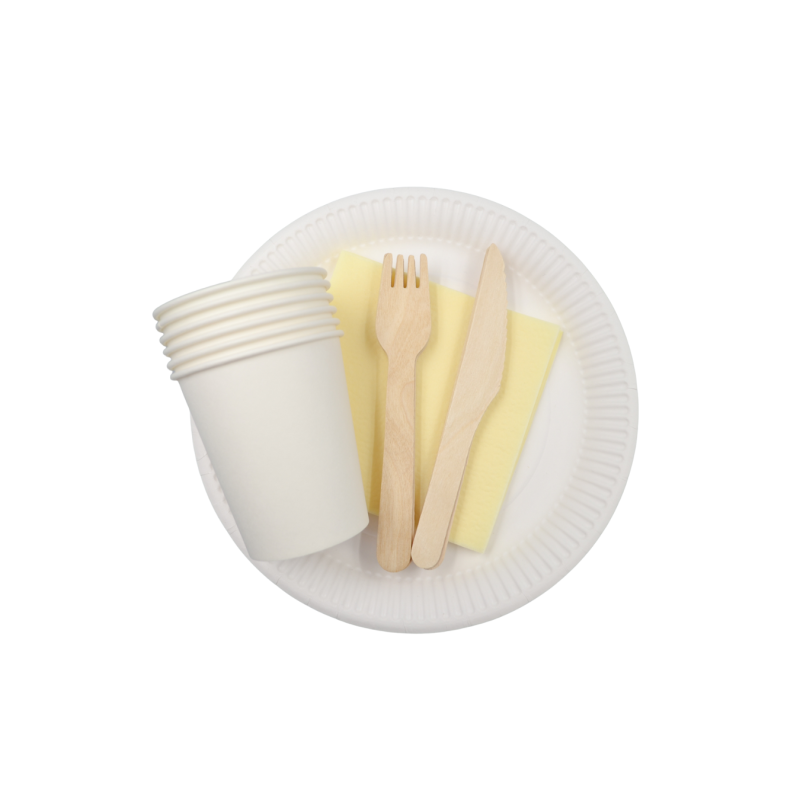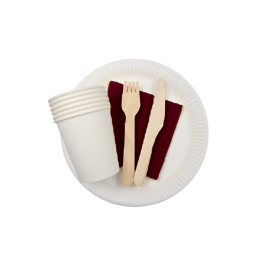 Vienkartinių indų rinkinys su mediniais stalo įrankiais ir servetėlėmis, 6 asmenims