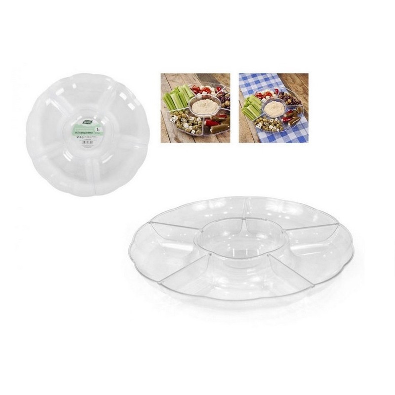 Permatomas daugkartinis užkandžių padėklas su 5 išoriniais skyriais ir centrine vieta padažui. Idealus pasirinkimas šventėms ar užkandžių pateikimui namuose.