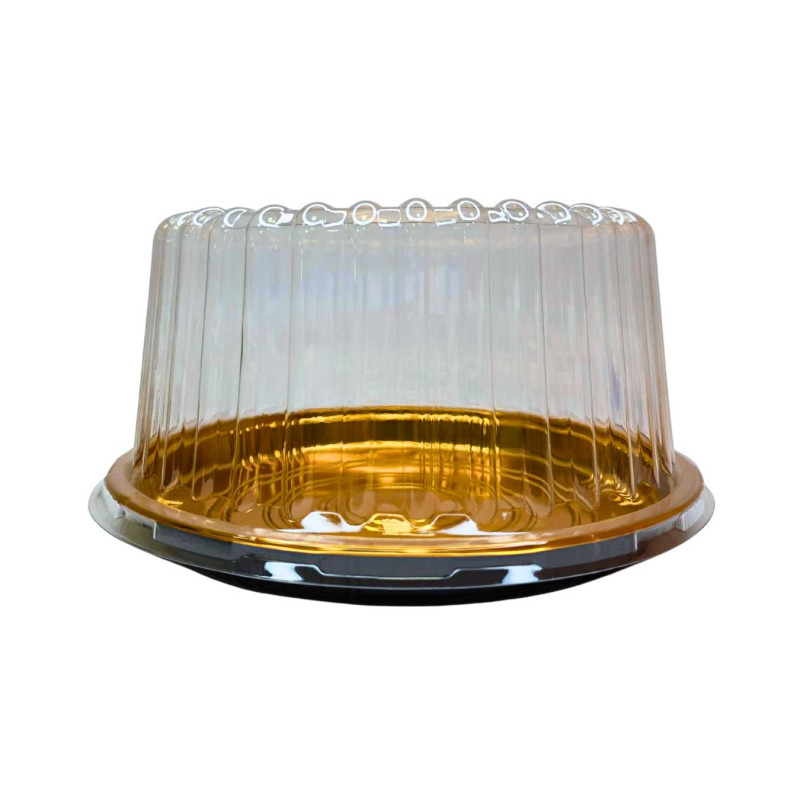 Praktiška ir estetiška plastikinė tortinė dėžutė su skaidriu kupolo formos dangteliu, skirta tortams, pyragams ir kitiems konditerijos gaminiams saugiai laikyti bei transportuoti. Tvirtas auksinės spalvos pagrindas suteikia elegancijos, todėl puikiai tinka tiek prekybai, tiek šventėms ar išvykoms.