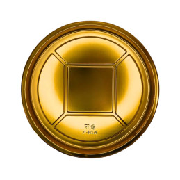 Didelė ir tvirta plastikinė dėžutė su skaidriu kupolo formos dangteliu, skirta tortams, pyragams bei kitiems kepiniams saugiai laikyti ir transportuoti. Auksinės spalvos pagrindas suteikia elegantišką ir reprezentatyvią išvaizdą, todėl puikiai tinka tiek prekybai, tiek šventėms ar ypatingoms progoms.