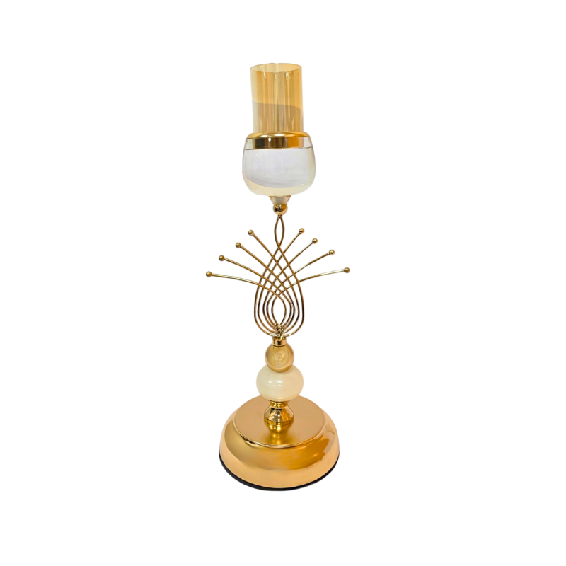 Elegantiška ir moderni žvakidė, išsiskirianti prabangia auksinės spalvos metalo konstrukcija ir dekoratyviniais lankais. Viršuje esantis švelniai tonuotas stiklo gaubtas sukuria jaukią, švelniai prislopintą šviesą ir apsaugo liepsną. Tvirtas pagrindas užtikrina stabilumą, o originalus dizainas puikiai dera tiek klasikiniame, tiek šiuolaikiniame interjere. Puikus pasirinkimas šventiniam stalui, namų dekorui ar stilingai dovanai.