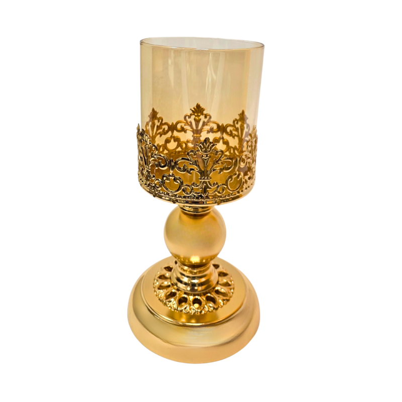 Prabangi auksinė žvakidė su stiklo gaubtu ir puošniu, ažūriniu ornamentuotu laikikliu. Dekoratyvinė detalė yra integruota ant žvakidės pagrindo dalies, todėl suteikia žvakidei elegantišką, klasikinį ir išskirtinį dizainą.